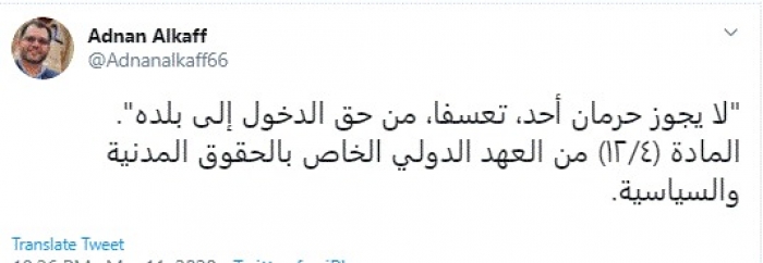 وقال في تغريدة عبر "تويتر" رصدها "المشهد العربي": "لا يجوز حرمان أحد، تعسفا، من حق الدخول إلى بلده. المادة (١٢/٤) من العهد الدولي الخاص بالحقوق المدنية والسياسية".