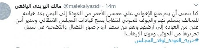 وقال في تغريدة عبر "تويتر" رصدها "المشهد العربي": "كنا نتمنى أن يتم منع الإخواني علي محسن الأحمر من العودة إلى اليمن بعد خيانته للتحالف بتسليم نهم والجوف للحوثي لنتفاجأ بمنع قيادات المجلس الانتقالي ومدير أمن عدن من العودة إلى أرضهم وهم من سطروا أروع صور النضال والتضحية في سبيل تحريرها من الحوثي وقوى الإرهاب".