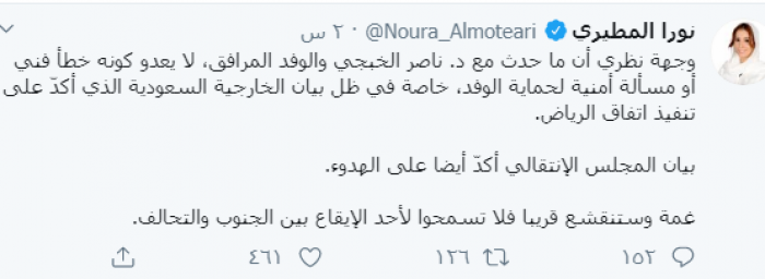 وقالت في تغريدة لها على "تويتر" رصدها "المشهد العربي":"وجهة نظري أن ما حدث مع د. ناصر الخبجي والوفد المرافق، لا يعدو كونه خطأ فني أو مسألة أمنية لحماية الوفد، خاصة في ظل بيان الخارجية السعودية الذي أكدّ على تنفيذ اتفاق الرياض".