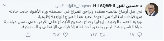 وأضاف:"توجيه الغضب الجنوبي إيجابيا يحتاج تصحيح الأوضاع على الأرض حتى تمس مباشرة حياة الناس و هذا ليس بمقدور أحد فعله إلا قيادتي الانتقالي و السعودية".