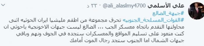 وأضاف:" الضالع ليست جبهات الاخونجية ياحوثي، إن كنت متعود على تسليم المواقع والمعسكرات ستجده في الجوف ونهم وباقي جبهات الشمال أما الجنوب ستجد رجال الموت أمامك".