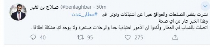 وقال في تغريدة عبر "تويتر" رصدها "المشهد العربي": "نشرت بعض الصفحات والمواقع خبرًا عن اشتباكات وتوتر في مطار عدن وهذا الخبر عارٍ من أي صحة".