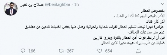 وكتب في تغريدة عبر "تويتر" رصدها "المشهد العربي": "بخصوص المطار الأمر طبيعي اليوم كما أكد لي الشباب لكن كان هناك مؤامرة فجرًا تهدف لتسليم المطار لقوات شمالية وإخوانية وصل منها بعض الضباط قادمين من معاشيق على متن مدرعات للتحالف".