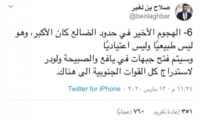 ونبه إلى تصاعد الهجمات الحوثية على جبهة الضالع، مؤكدا أن: "الهجوم الأخير في حدود الضالع كان الأكبر، وهو ليس طبيعيا وليس اعتياديا"، حيث تصدت القوات الجنوبية لهجمات على مدار 10 ساعات بجبهات الجب وبتار وثرة.