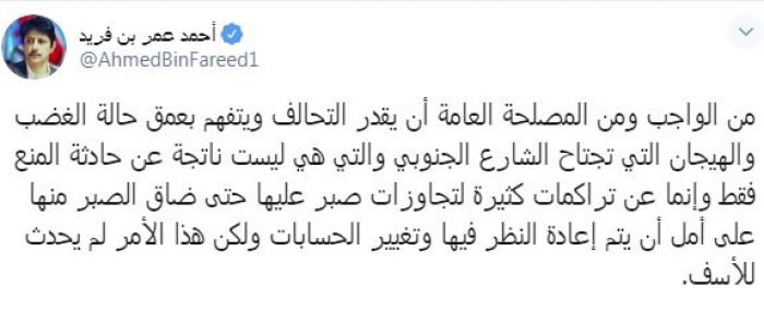 وقال في تغريدة عبر "تويتر" رصدها "المشهد العربي": "من الواجب ومن المصلحة العامة أن يقدر التحالف ويتفهم بعمق حالة الغضب والهيجان التي تجتاح الشارع الجنوبي".