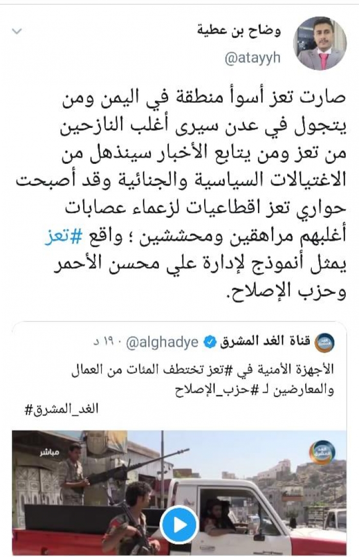 قال الكاتب الصحفي وضاح بن عطية، اليوم، إن محافظة تعز تمثل نموذجا لإدارة الإرهابي علي محسن الأحمر وحزب الإصلاح.