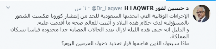 لقور يشيد بإجراءات السعودية الوقائية ضد كورونا