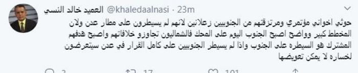 وأضاف: "فالشماليون تجاوزوا خلافاتهم وأصبح هدفهم المشترك هو السيطرة على الجنوب وإذا لم يسيطر الجنوبيين على كامل القرار في عدن سيتعرضون لخسارة لا يمكن تعويضها".