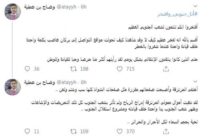 وكتب في تغريدات عبر "تويتر" رصدها "المشهد العربي": "أنا جنوبي وافتخر افتخروا انكم تنتمون للشعب الجنوبي العظيم أقسم بالله إنه لفخر عظيم كيف لا وقد شاهدنا كيف تحولت مواقع التواصل إلى بركان غاضب بكلمة واحدة خلف قيادة واحدة عندما شعروا بالخطر حتى الذين كانوا ينتقدون الانتقالي بشكل يومي لقد رأيتهم أكثر منا حرصا وحبا للقيادة وللوطن".