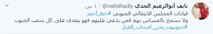 قال الناشط السياسي نايف أبو الزعيم الحدي، اليوم الأحد، إن قيادات المجلس الانتقالي الجنوبي خط أحمر.