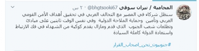 وأضافت :" وفي نفس الوقت ثابتين على مبادئ وتطلعات شعب الجنوب الذي قدم ومازال يقدم كوكبة من الشهداء في فك الارتباط واستعادة الدولة كاملة السيادة".
