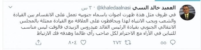 وكتب النسي عبر تغريدة له على "تويتر" رصدها "المشهد العربي":"في ظروف مثل هذه ظهرت أصوات بأسماء جنوبية تعمل على الانقسام بين القيادة والشعب ويجب الانتباه لهذا ويحافظون على العلاقة مع القيادة ممثلة بالمجلس الانتقالي الجنوبي بقيادة الرئيس القائد عيدروس الزبيدي".