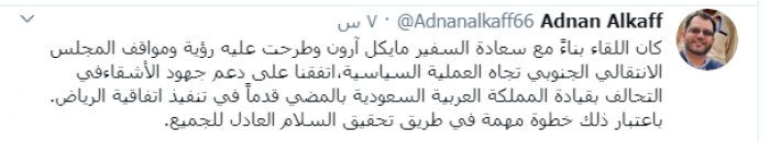 وكتب الكاف عبر تغريدة له على "تويتر" رصدها "المشهد العربي":" كان اللقاء بناءً مع سعادة السفير مايكل آرون وطرحت عليه رؤية ومواقف المجلس الانتقالي الجنوبي تجاه العملية السياسية".