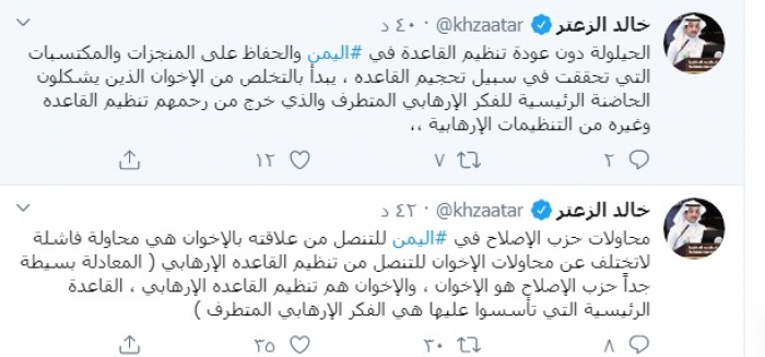 وكتب الزعتر عبر سلسة تغريدات على "تويتر" رصدها "المشهد العربي" :"محاولات حزب الإصلاح في اليمن للتنصل من علاقته بالإخوان هي محاولة فاشلة لا تختلف عن محاولات الإخوان للتنصل من تنظيم القاعدة الإرهابي".