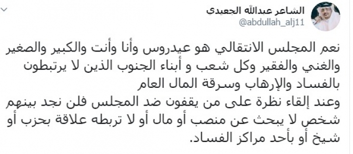 وكتب الجعيدي عبر تغريدة له على "تويتر" رصدها "المشهد العربي":"نعم المجلس الانتقالي هو عيدروس وأنا وأنت والكبير والصغير والغني والفقير وكل شعب و أبناء الجنوب الذين لا يرتبطون بالفساد والإرهاب وسرقة المال العام".