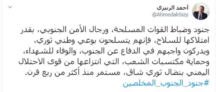 وكتب الربيزي عبر سلسلة تغريدات رصدها "المشهد العربي":"جنودنا الجنوبيون البواسل جاؤوا من ميادين النضال السلمي وتشبعوا بفكر الثورة الجنوبية التحررية".