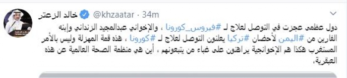 وقال في تغريدة عبر "تويتر" رصدها "المشهد العربي": "دول عظمى عجزت في التوصل لعلاج لفيروس كورونا، والإخواني عبدالمجيد الزنداني وابنه الفارين من اليمن لأحضان تركيا يعلنون التوصل لعلاج لكورونا، هذه قمة المهزلة وليس بالأمر المستغرب هكذا هم الإخوانجية يراهنون على غباء من يتبعونهم، أين هي منظمة الصحة العالمية عن هذه العبقرية".