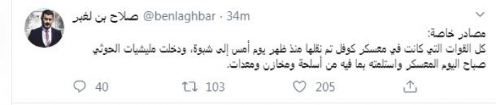 وقال في تغريدة عبر "تويتر" رصدها "المشهد العربي": "مصادر خاصة: كل القوات التي كانت في معسكر كوفل تم نقلها منذ ظهر يوم أمس إلى شبوة، ودخلت مليشيات الحوثي صباح اليوم المعسكر واستلمته بما فيه من أسلحة ومخازن ومعدات".