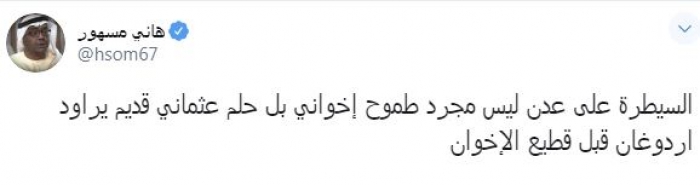 وكتب في تغريدة عبر "تويتر" رصدها "المشهد العربي": "السيطرة على عدن ليس مجرد طموح إخواني بل حلم عثماني قديم يراود أردوغان قبل قطيع الإخوان".