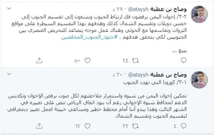 وكتب بن عطية عبر سلسلة تغريدات رصدها "المشهد العربي":"تمكين إخوان اليمن من شبوة واستمرار ملاحقتهم لكل صوت يرفض الإخوان وتكديس الدعم لمحافظ شبوة الإخواني رغم أن بنود اتفاق الرياض تنص على تغييره في الشهر الثالث وهذا يبدو أننا أمام مخطط خطير ومساعي خبيثة لعمل تغيير ديمغرافي لتقسيم الجنوب وتقسيم الشمال".