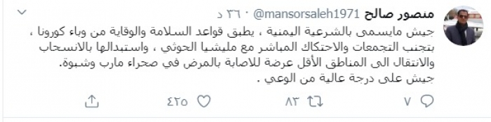 وكتب صالح عبر تغريدة له على "تويتر" رصدها "المشهد العربي":"جيش مايسمى بالشرعية اليمنية ، يطبق قواعد السلامة والوقاية من وباء كورونا ، بتجنب التجمعات والاحتكاك المباشر مع مليشيا الحوثي ، واستبدالها بالانسحاب والانتقال إلى المناطق الأقل عرضة للإصابة بالمرض في صحراء مأرب وشبوة.