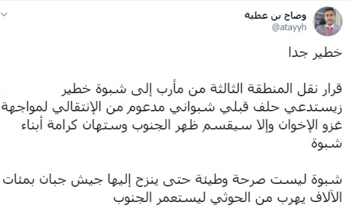 وكتب بن عطية عبر تغريدة له على "تويتر" رصدها "المشهد العربي":"خطير جدا،قرار نقل المنطقة الثالثة من مأرب إلى شبوة خطير ويستدعي حلف قبلي شبواني مدعوم من الانتقالي لمواجهة غزو الإخوان وإلا سيقسم ظهر الجنوب وستهان كرامة أبناء شبوة".