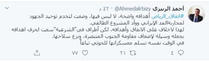 وكتب الربيزي عبر تغريدة له على "تويتر" رصدها "المشهد العربي":"اتفاق الرياض أهدافه واضحة، لا لبس فيها، وضعت لتخدم توحيد الجهود لمحاربة المد الإيراني ووأد المشروع الطائفي".