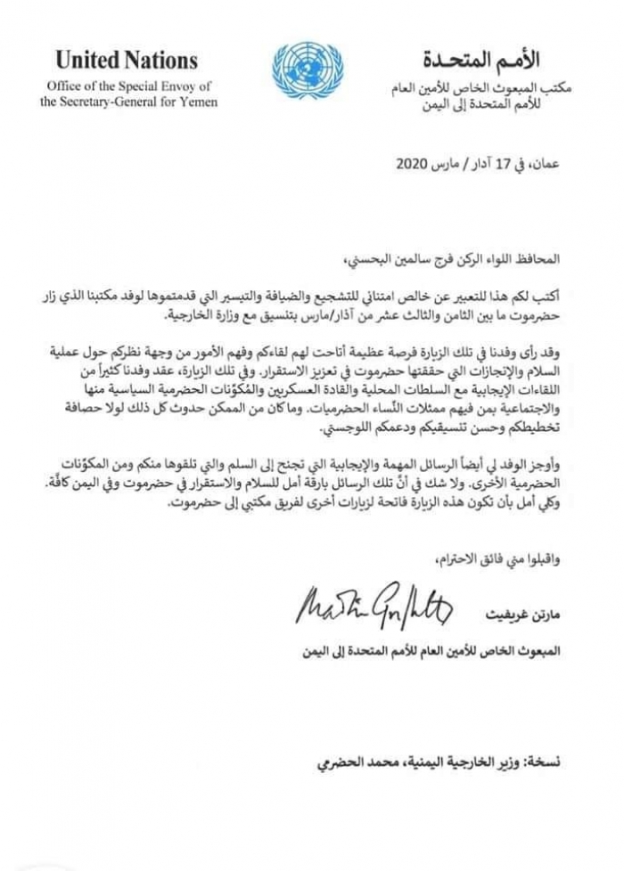 غريفيث: تلقيت رسائل إيجابية من زيارة الوفد الأممي لحضرموت (وثيقة)