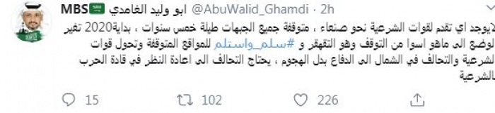 قال الناشط السياسي السعودي أبو وليد الغامدي، اليوم، إن التحالف العربي يحتاج لإعادة النظر في قادة الحرب بحكومة الشرعية.