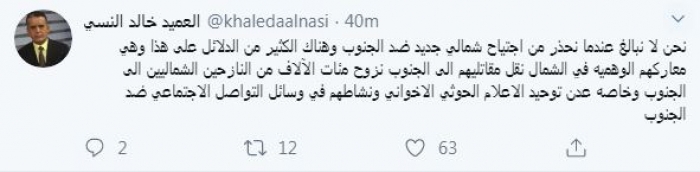 وقال في تغريدة عبر "تويتر" رصدها "المشهد العربي": "نحن لا نبالغ عندما نحذر من اجتياح شمالي جديد ضد الجنوب وهناك الكثير من الدلائل على هذا وهي معاركهم الوهمية في الشمال، نقل مقاتليهم إلى الجنوب، نزوح مئات الآلاف من النازحين الشماليين إلى الجنوب، وخاصة عدن، توحيد الإعلام الحوثي الإخواني ونشاطهم في وسائل التواصل الاجتماعي ضد الجنوب".