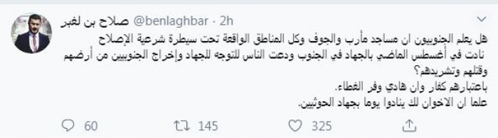 وكتب في تغريدة عبر "تويتر" رصدها "المشهد العربي": "هل يعلم الجنوبيون أن مساجد مأرب والجوف وكل المناطق الواقعة تحت سيطرة شرعية الإصلاح نادت في أغسطس الماضي بالجهاد في الجنوب ودعت الناس للتوجه للجهاد وإخراج الجنوبيين من أرضهم وقتلهم وتشريدهم؟ باعتبارهم كفار وأن هادي وفر الغطاء. علمًا بأن الإخوان لم ينادوا يومًا بجهاد الحوثيين".