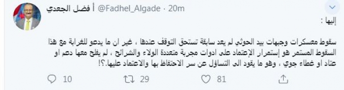 وكتب في تغريدة عبر "تويتر" رصدها "المشهد العربي": "سقوط معسكرات وجبهات بيد الحوثي لم يعد سابقة تستحق التوقف عندها ، غير أن ما يدعو للغرابة مع هذا السقوط المستمر هو استمرار الاعتماد على أدوات مجربة متعددة الولاء والشرائح، لم يفلح معها دعم أو عتاد أو غطاء جوي، وهو ما يقود إلى التساؤل عن سر الاحتفاظ بها والاعتماد عليها".