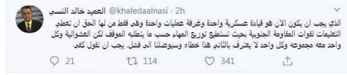 طالب الكاتب والمحلل العسكري العميد خالد النسي، اليوم، بوجود قيادة عسكرية وغرفة عمليات واحدة وذلك لإعطاء التعليمات لقوات المقاومة الجنوبية وتوزيع المهام بحسب ما يتطلب الموقف.