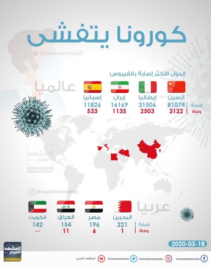 ويقدم "المشهد العربي" لقرائه آخر تطورات انتشار الفيروس وعدد المُصابين به حول العالم من خلال الإنفوجراف التالي: