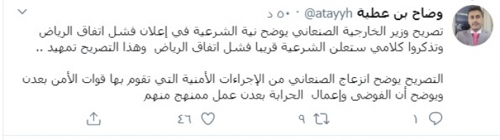 وكتب بن عطية عبر تغريدة له على "تويتر" رصدها "المشهد العربي":"تصريح وزير الخارجية الصنعاني يوضح نية الشرعية في إعلان فشل اتفاق الرياض وتذكروا كلامي ستعلن الشرعية قريبا فشل اتفاق الرياض وهذا التصريح تمهيد".