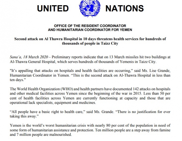 منسقة الشؤون الإنسانية: مصدومة من الهجوم الحوثي على المستشفيات (وثيقة)
