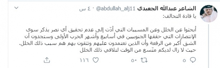 وكتب الجعيدي عبر تغريدة له على "تويتر" رصدها "المشهد العربي":"يا قادة التحالف: ابحثوا عن الخلل وعن المسببات التي أدّت إلى عدم تحقيق أي نصر يذكر سوى الانتصارات التي حققها الجنوبيين في أسابيع وأشهر الحرب الأولى".
