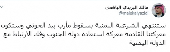 وكتب اليافعي عبر تغريدة له على "تويتر" رصدها "المشهد العربي":" ستنتهي الشرعية اليمنية بسقوط مأرب بيد الحوثي وستكون معركتنا القادمة معركة استعادة دولة الجنوب وفك الارتباط مع الدولة اليمنية".