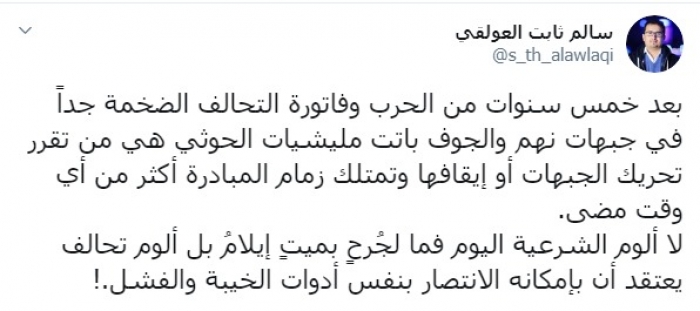 وكتب العولقي عبر تغريدة له على "تويتر" رصدها "المشهد العربي":"بعد خمس سنوات من الحرب وفاتورة التحالف الضخمة جداً في جبهات نهم والجوف باتت مليشيات الحوثي هي من تقرر تحريك الجبهات أو إيقافها وتمتلك زمام المبادرة أكثر من أي وقت مضى".