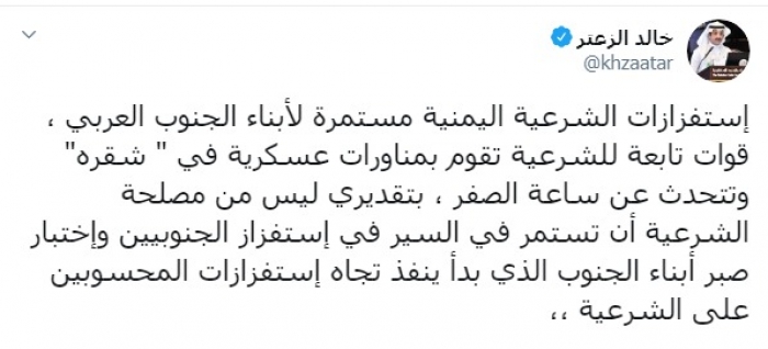 وكتب الزعتر عبر تغريدة له على "تويتر" رصدها "المشهد العربي":"استفزازات الشرعية اليمنية مستمرة لأبناء الجنوب العربي ، قوات تابعة للشرعية تقوم بمناورات عسكرية في " شقرة" وتتحدث عن ساعة الصفر".