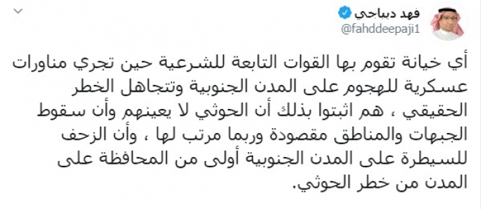 وكتب ديباحي عبر تغريدة له على "تويتر" رصدها " المشهد العربي" :"أي خيانة تقوم بها القوات التابعة للشرعية حين تجري مناورات عسكرية للهجوم على المدن الجنوبية وتتجاهل الخطر الحقيقي".