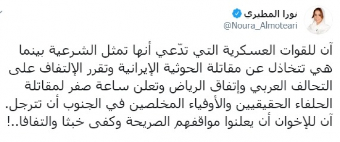 وكتبت المطيري عبر تغريدة لها على "تويتر" رصدها "المشهد العربي":"آن للقوات العسكرية التي تدّعي أنها تمثل الشرعية بينما هي تتخاذل عن مقاتلة الحوثية الإيرانية وتقرر الالتفاف على التحالف العربي واتفاق الرياض وتعلن ساعة صفر لمقاتلة الحلفاء الحقيقيين والأوفياء المخلصين في الجنوب أن تترجل".