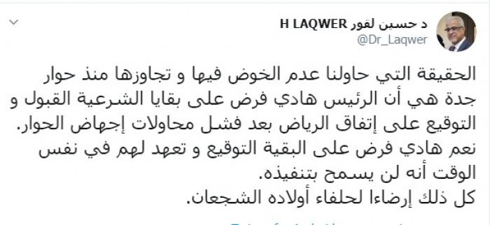 وكتب لقور عبر تغريدة له على "تويتر" رصدها "المشهد العربي":"الحقيقة التي حاولنا عدم الخوض فيها و تجاوزها منذ حوار جدة هي أن الرئيس هادي فرض على بقايا الشرعية القبول و التوقيع على اتفاق الرياض بعد فشل محاولات إجهاض الحوار".