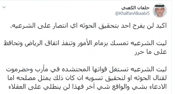 وكتب الكعبي عبر تغريدة له على "تويتر" رصدها "المشهد العربي":"أكيد لن يفرح أحد بتحقيق الحوثة إي انتصار على الشرعية،ليت الشرعية تمسك بزمام الأمور وتنفذ اتفاق الرياض وتحافظ على ما حرر".