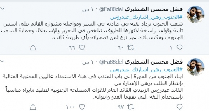 وكتب الشطيري عبر سلسلة تغريدات رصدها "المشهد العربي":" أبناء الجنوب من المهرة إلى باب المندب في هبة الاستعداد عاليين المعنوية القتالية بانتظار الطلب، برهن الإشارة من القائد عيدروس الزبيدي القائد العام للقوات المسلحة الجنوبية لتنفيذ ما يراه مناسباً باستخدام اللغة التي يفهما العدو وأعوانه".