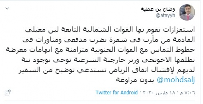 وكتب "بن عطية" في تغريدة عبر حسابه بتويتر، رصدها "المشهد العربي" قال فيها: "استفزازات تقوم بها القوات الشمالية التابعة لبن معيلي القادمة من مأرب في شقرة بضرب مدفعي ومناورات في خطوط التماس مع القوات الجنوبية متزامنة مع اتهامات مغرضة يطلقها الإخونجي وزير خارجية الشرعية، توحي بوجود نية لديهم لإفشال اتفاق الرياض تستدعي توضيح من السفير".