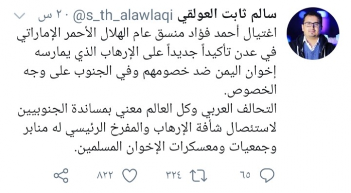 واعتبر، في تغريدة على حسابه بموقع تويتر،تابعها "المشهد العربي"، إن: "اغتيال أحمد فؤاد منسق عام الهلال الأحمر الإماراتي في عدن تأكيد جديد على الإرهاب الذي يمارسه إخوان اليمن ضد خصومهم وفي الجنوب على وجه الخصوص".