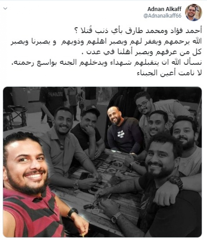 وأضاف: "الله يرحمهم ويغفر لهم ويصبر أهلهم وذويهم و يصبرنا ويصبر كل من عرفهم ويصبر أهلنا في عدن" .