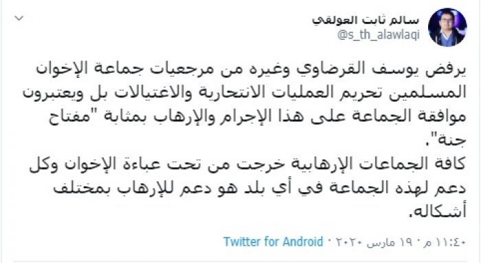 وكتب "العولقي في تغريدة عبر حسابه بتويتر، رصدها المشهد العربي": "يرفض يوسف القرضاوي وغيره من مرجعيات جماعة الإخوان المسلمين تحريم العمليات الانتحارية والاغتيالات بل ويعتبرون موافقة الجماعة على هذا الإجرام والإرهاب بمثابة "مفتاح جنة".