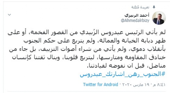 وكتب "الربيزي" في تغريدة عبر حسابه بتويتر، رصدها "المشهد العربي": "لم يأتي الرئيس عيدروس الزُبيدي من القصور الفخمة، أو على ظهر دبابة الخيانة والعمالة، ولم يتربع على حكم الجنوب بانقلاب دموي، ولم يأتي من شراء أصوات التزييف".